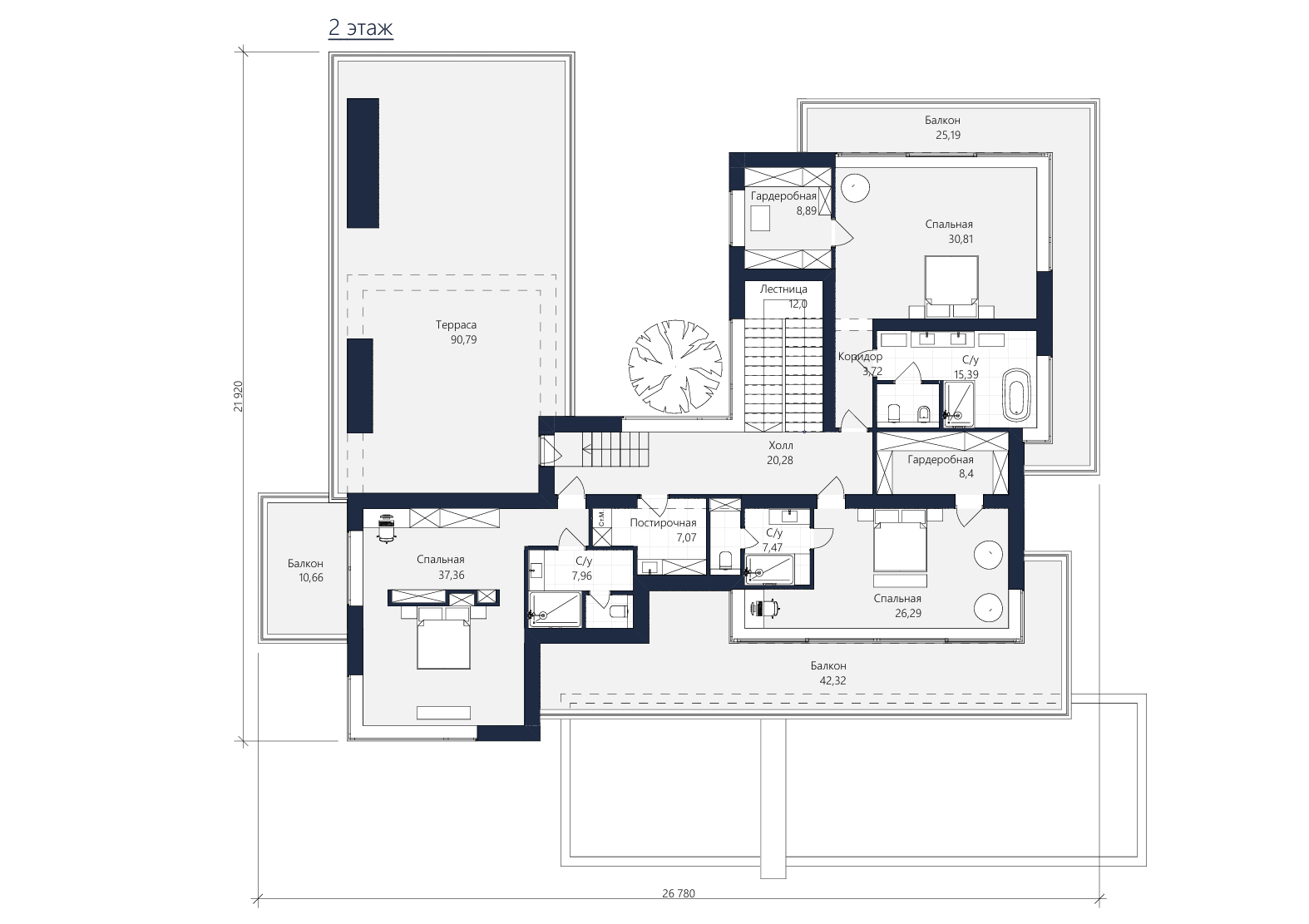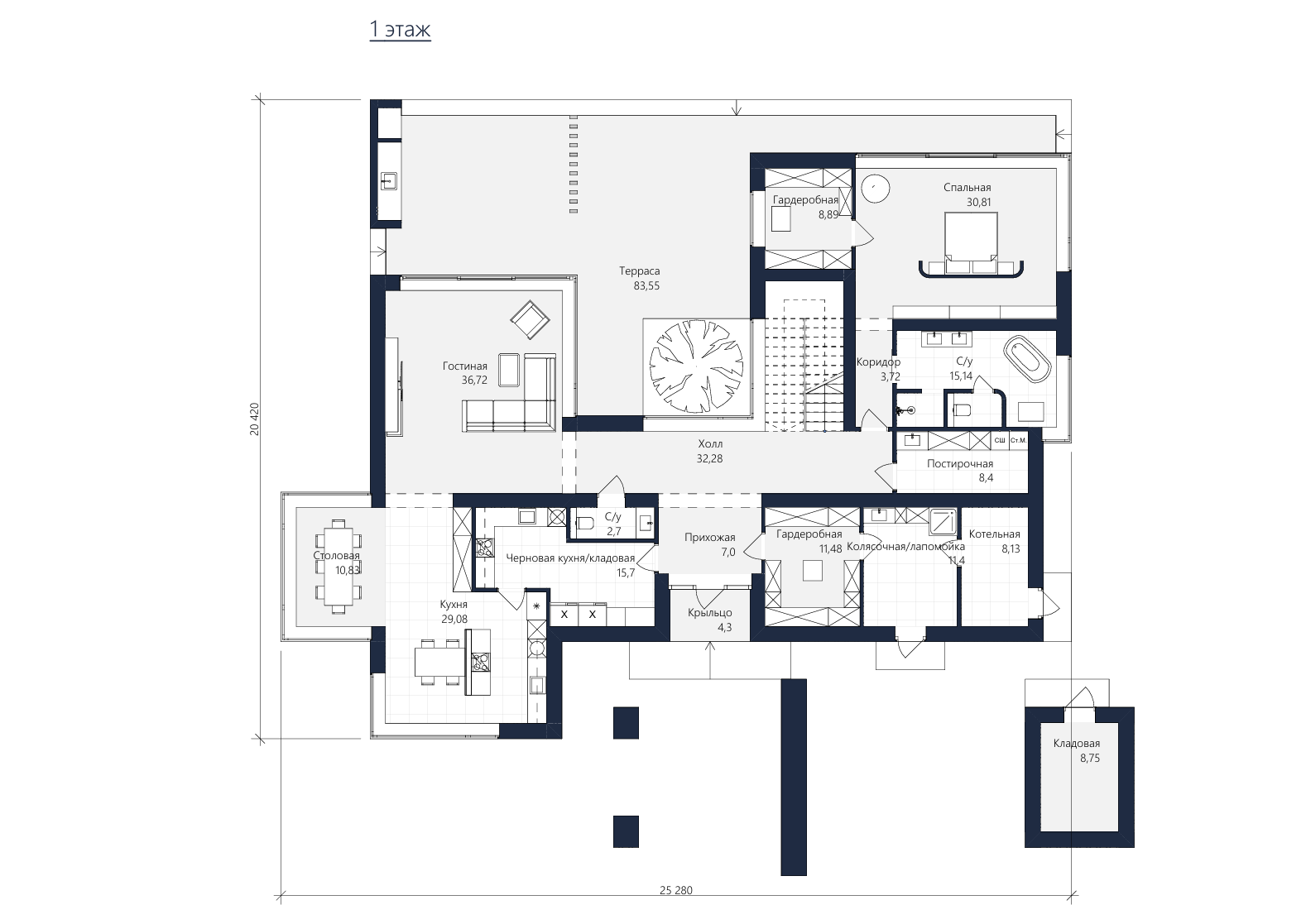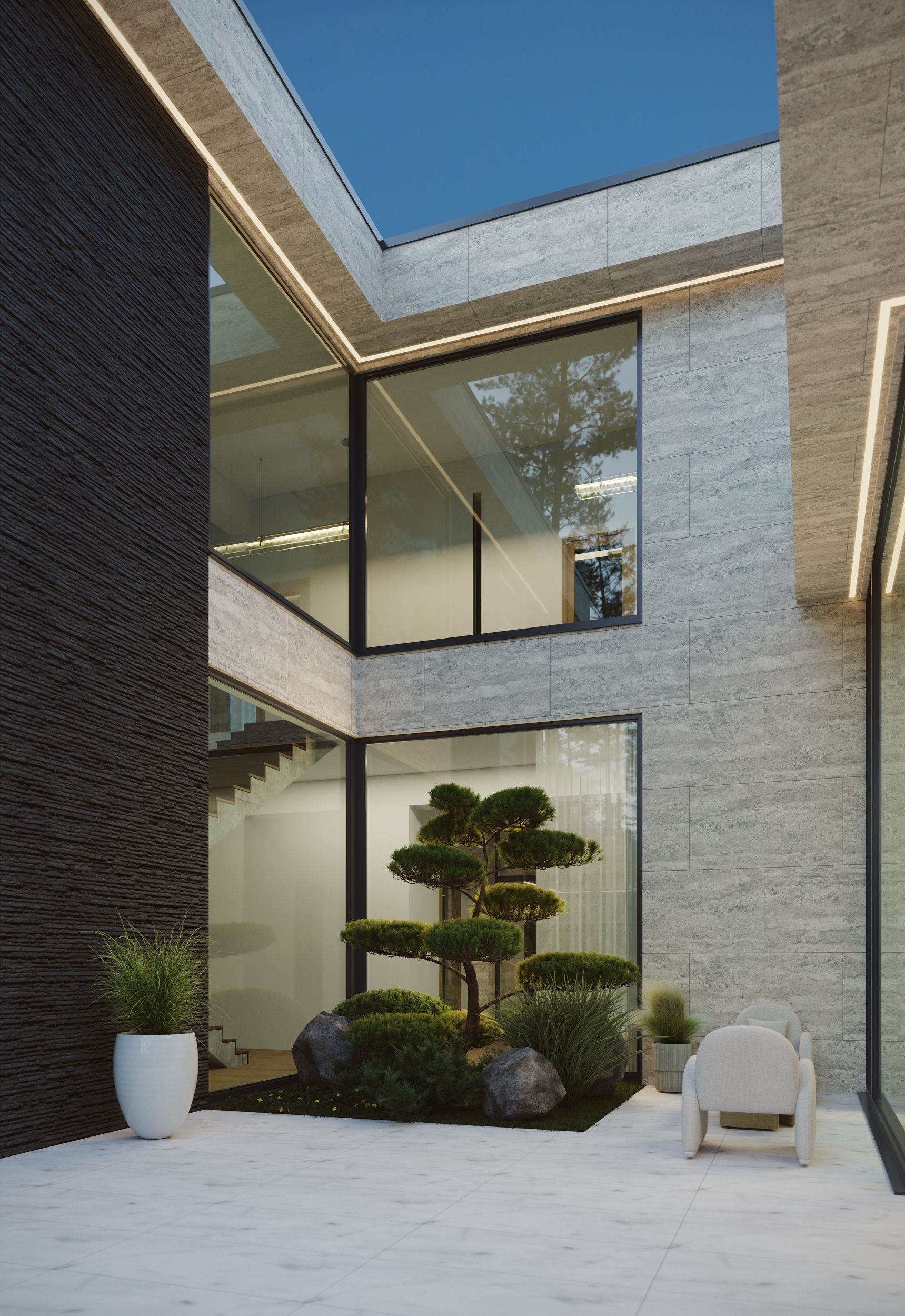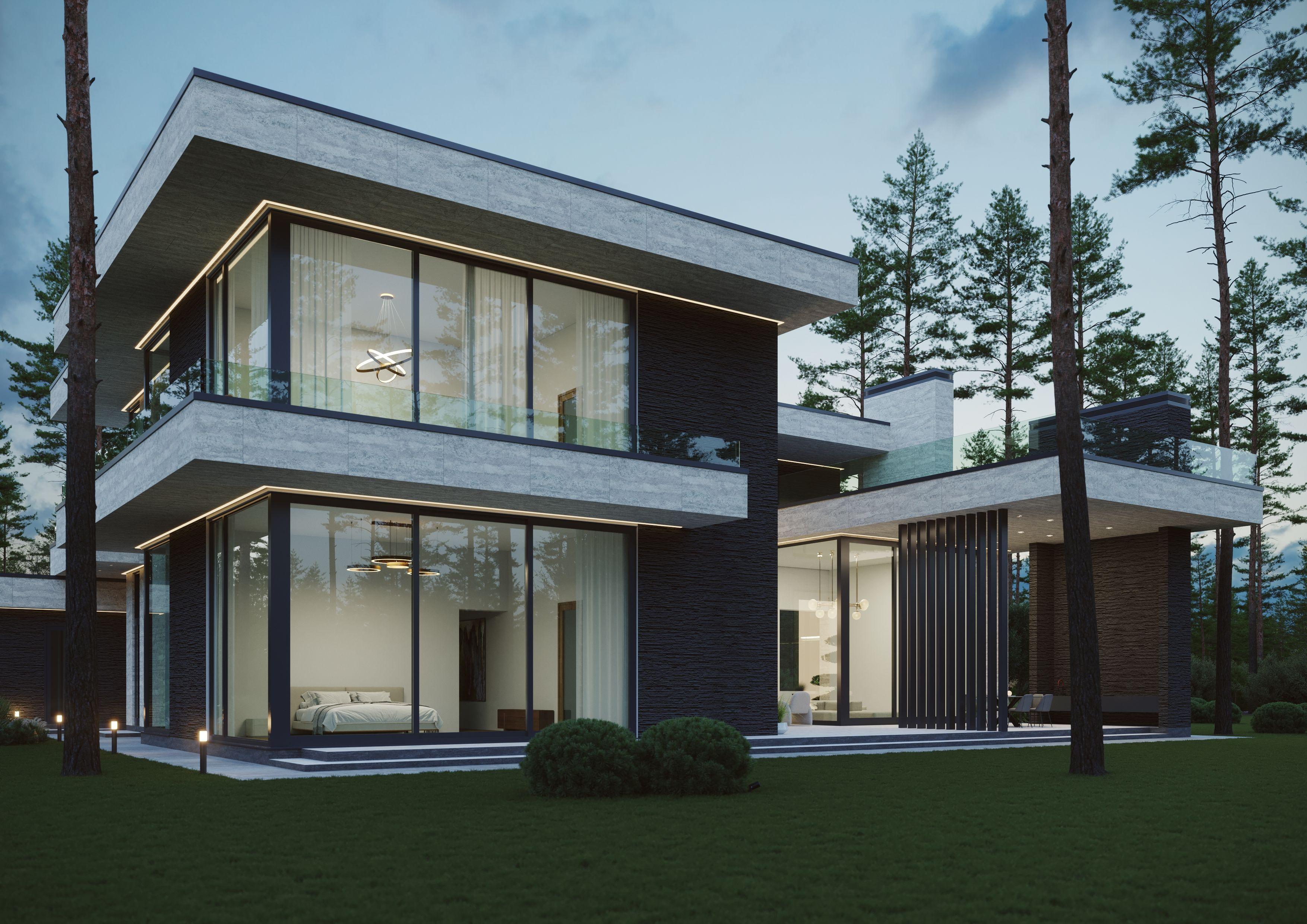 Проект «Бонсай 1» — это воплощение современного хайтек-стиля, где каждая деталь подчинена идее функциональности и эстетики. Его название как нельзя лучше отражает философию дома: идеальный баланс форм, лаконичность и красота, обрамлённая панорамным остеклением. Этот двухэтажный дом площадью 412.47 м² предлагает просторное и продуманное жизненное пространство. Четыре просторные комнаты и пять санузлов обеспечивают комфорт для большой семьи. Панорамные окна не только наполняют интерьеры естественным светом, но и стирают границу между внутренним уютом и внешним миром, создавая эффект единения с природой.