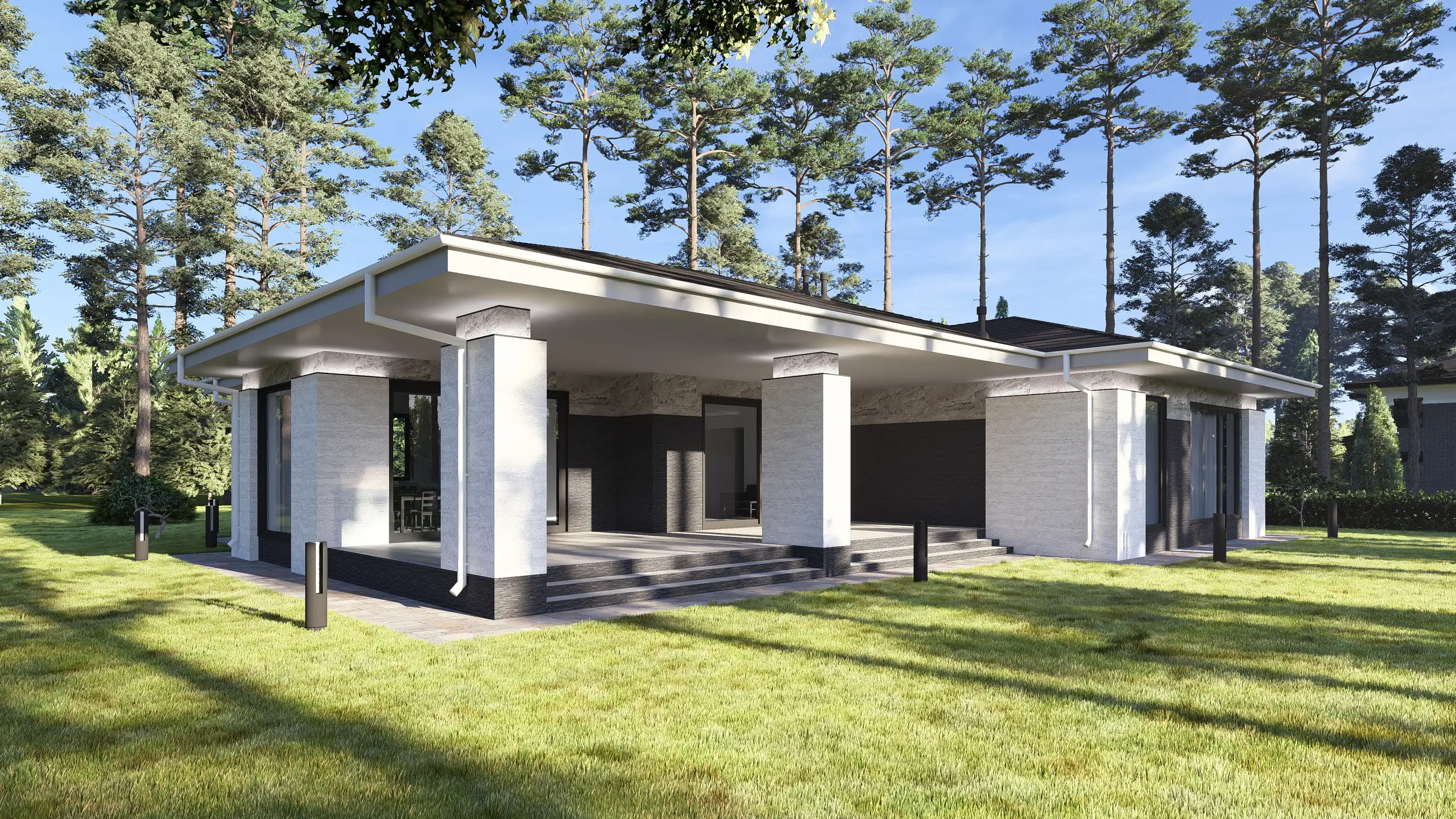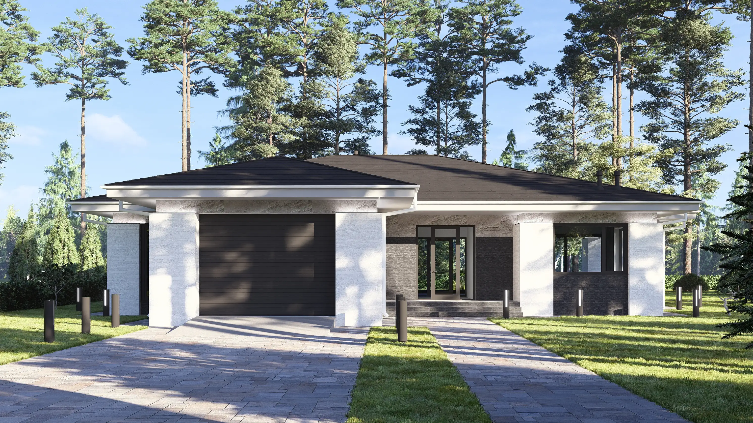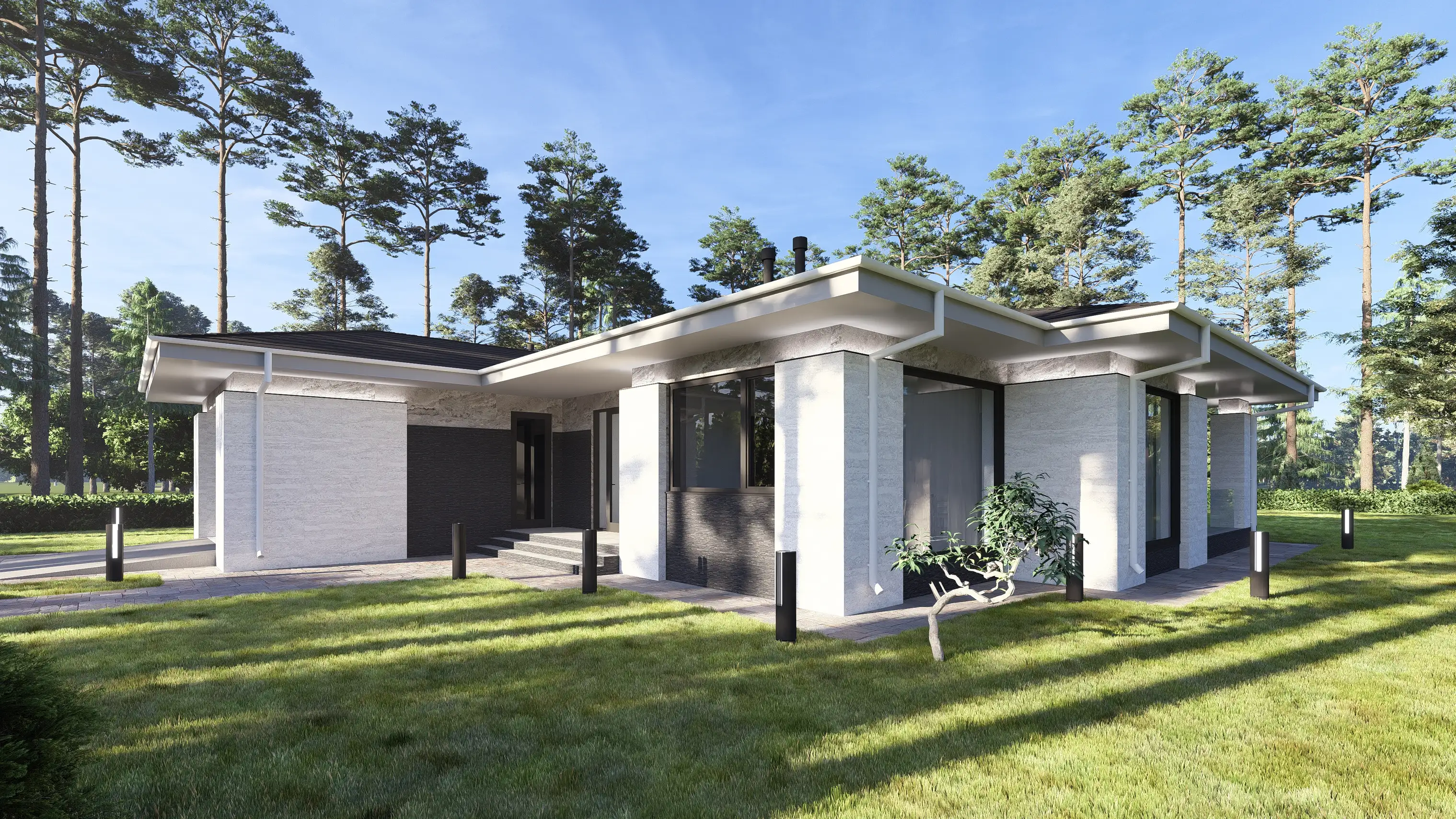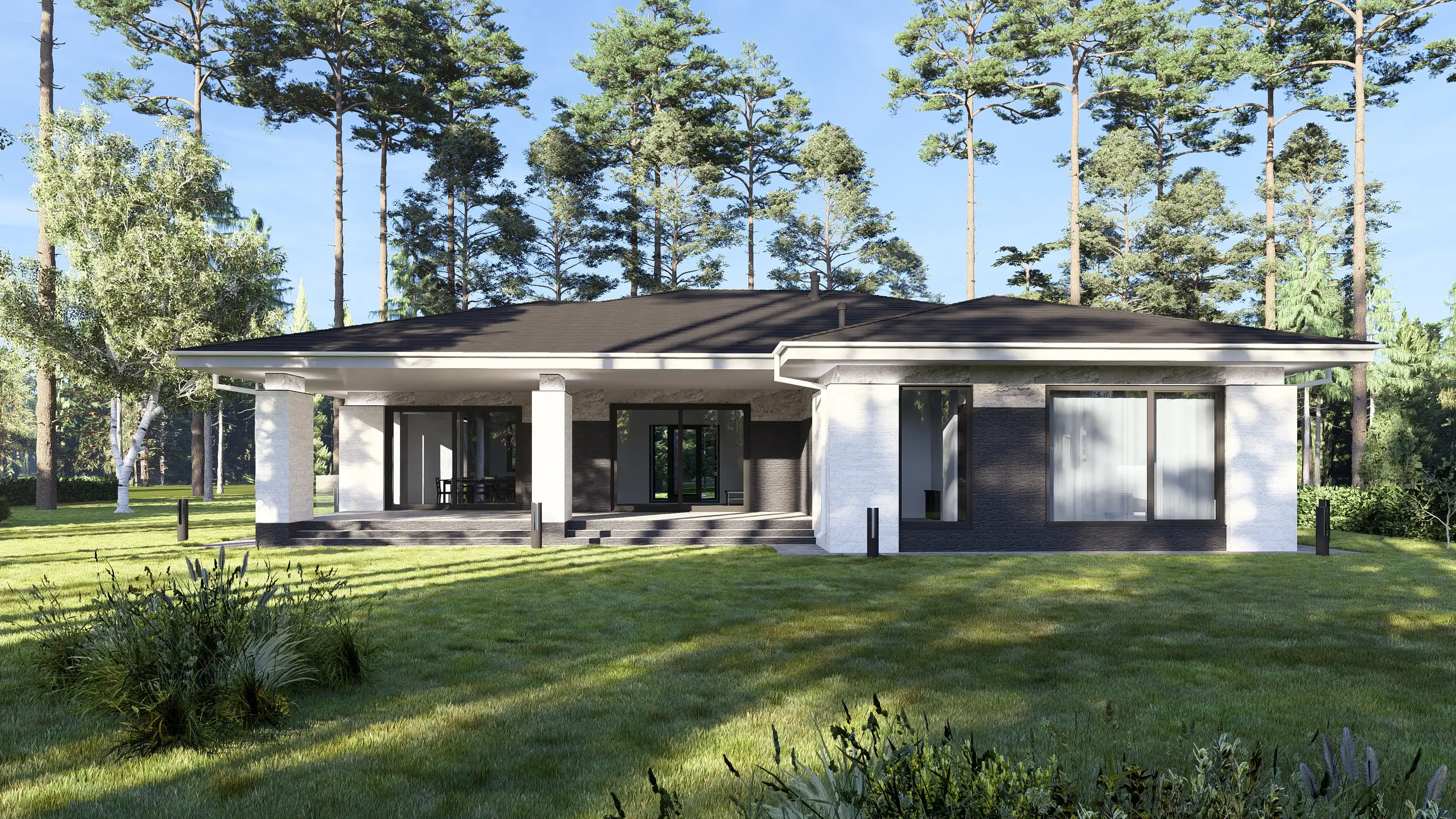 Проект «Майен» воплощает философию знаменитого стиля Райта — «органической архитектуры», где дом становится естественным продолжением ландшафта. Для этого стиля характерны горизонтальные линии, выступающие кровельные свесы, массивность и визуальная «приземленность», создающая ощущение надежности и умиротворения. Этот одноэтажный дом площадью 263.01 м² предлагает невероятно комфортную и продуманную планировку. Благодаря рациональному зонированию, жилая площадь составляет 211.64 м², что делает пространство исключительно эффективным. Три просторные комнаты и три санузла обеспечивают уют для семьи, а встроенный гараж добавлявает бытового удобства.