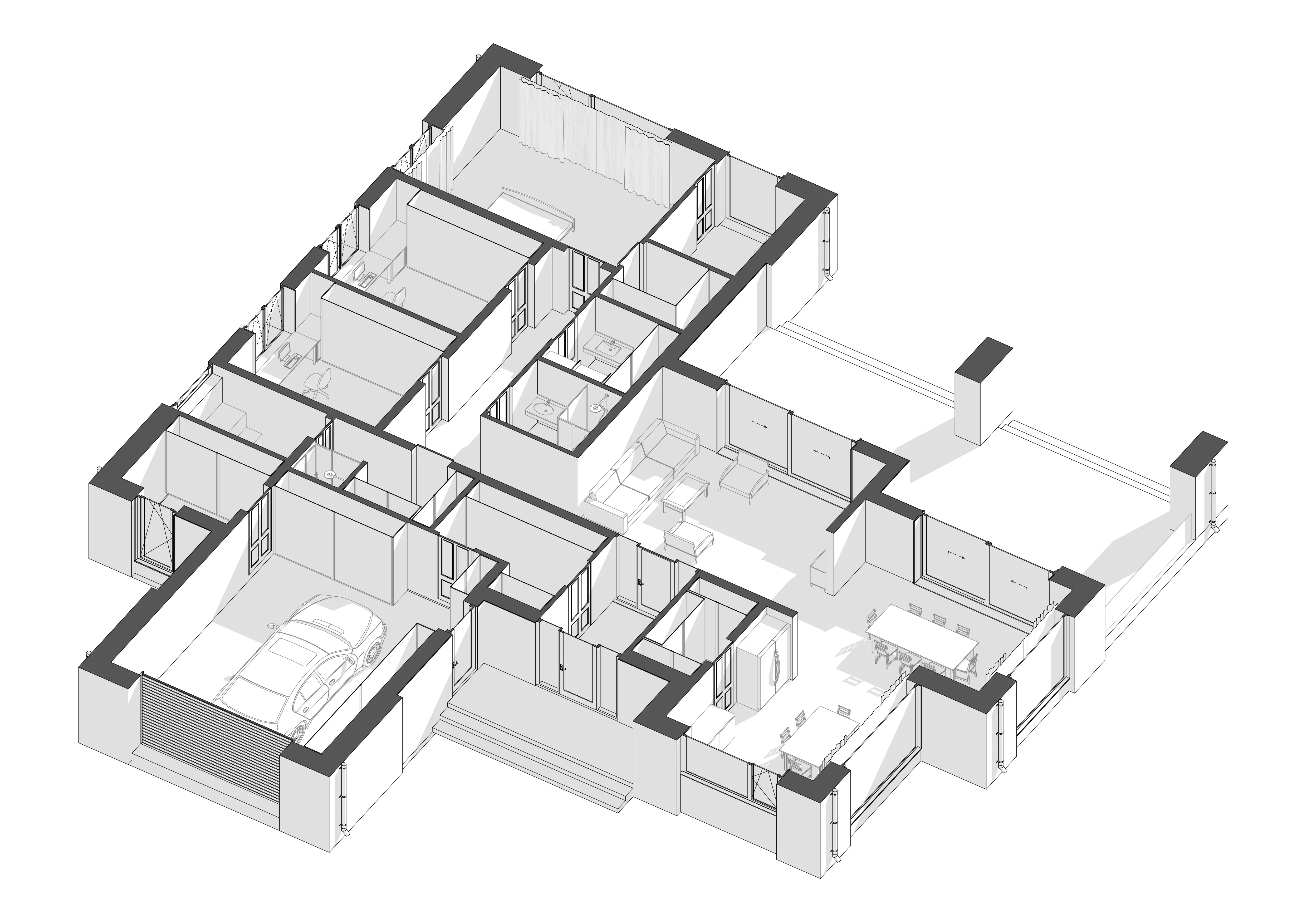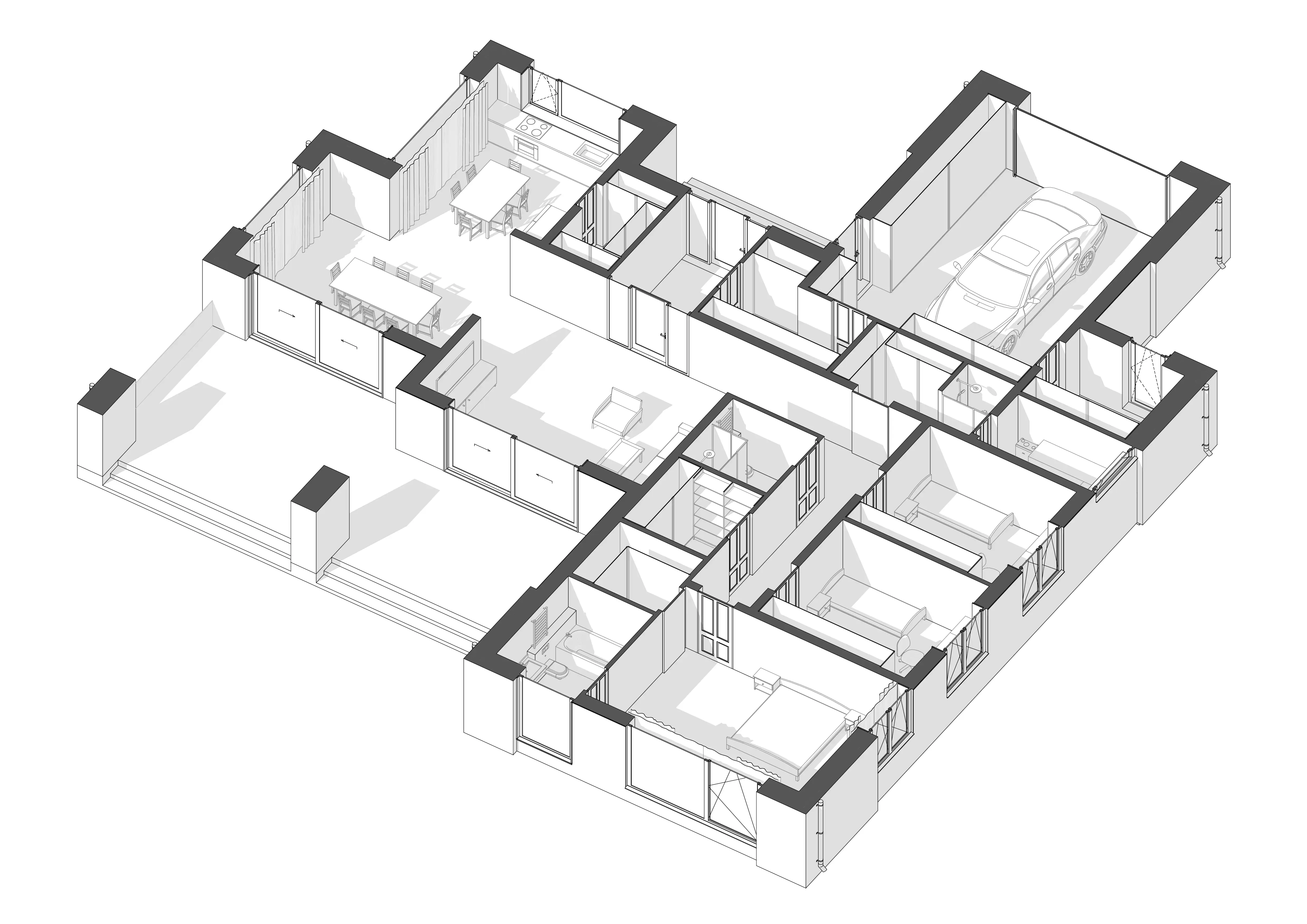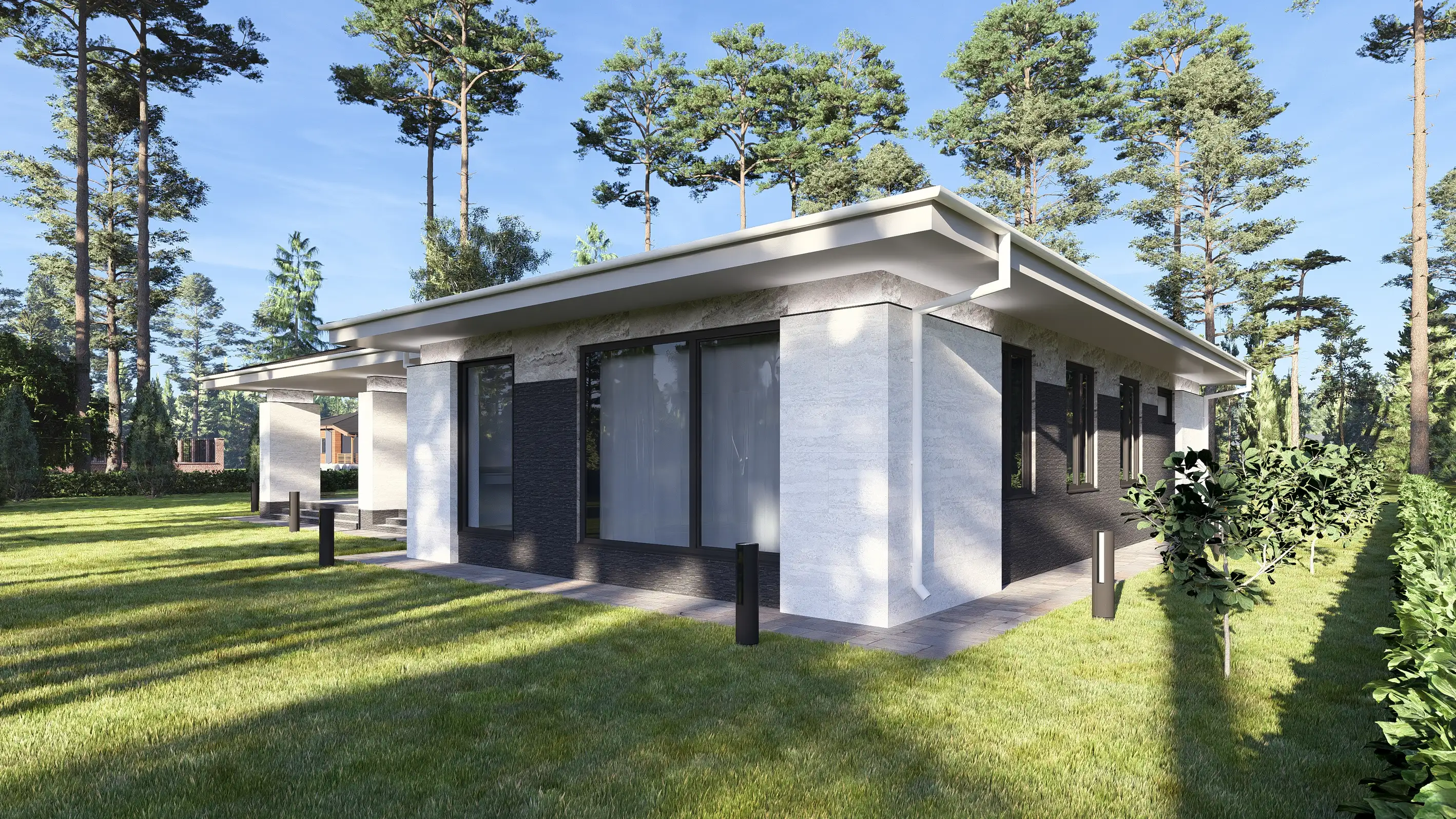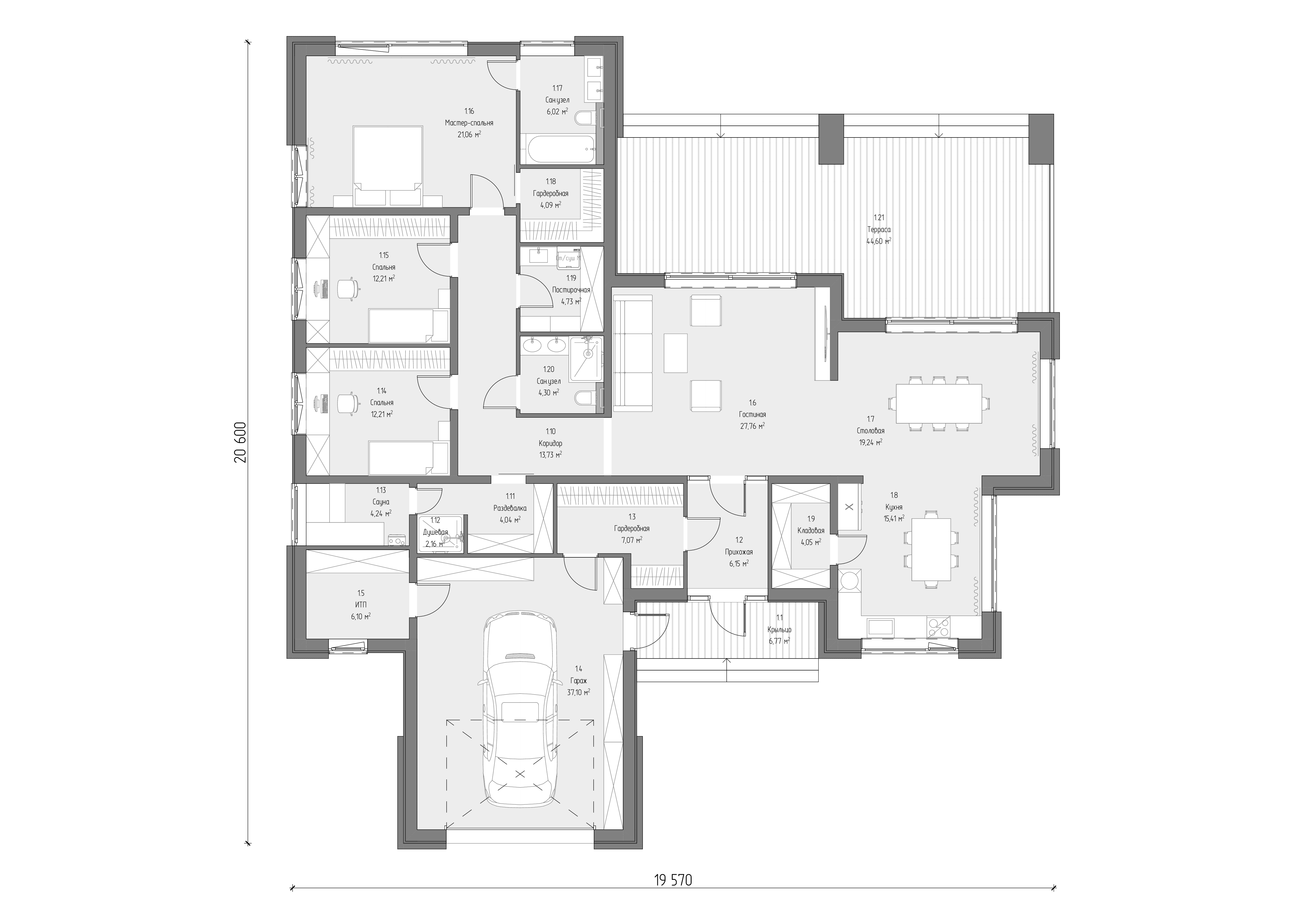 Проект «Майен» воплощает философию знаменитого стиля Райта — «органической архитектуры», где дом становится естественным продолжением ландшафта. Для этого стиля характерны горизонтальные линии, выступающие кровельные свесы, массивность и визуальная «приземленность», создающая ощущение надежности и умиротворения. Этот одноэтажный дом площадью 263.01 м² предлагает невероятно комфортную и продуманную планировку. Благодаря рациональному зонированию, жилая площадь составляет 211.64 м², что делает пространство исключительно эффективным. Три просторные комнаты и три санузла обеспечивают уют для семьи, а встроенный гараж добавлявает бытового удобства.