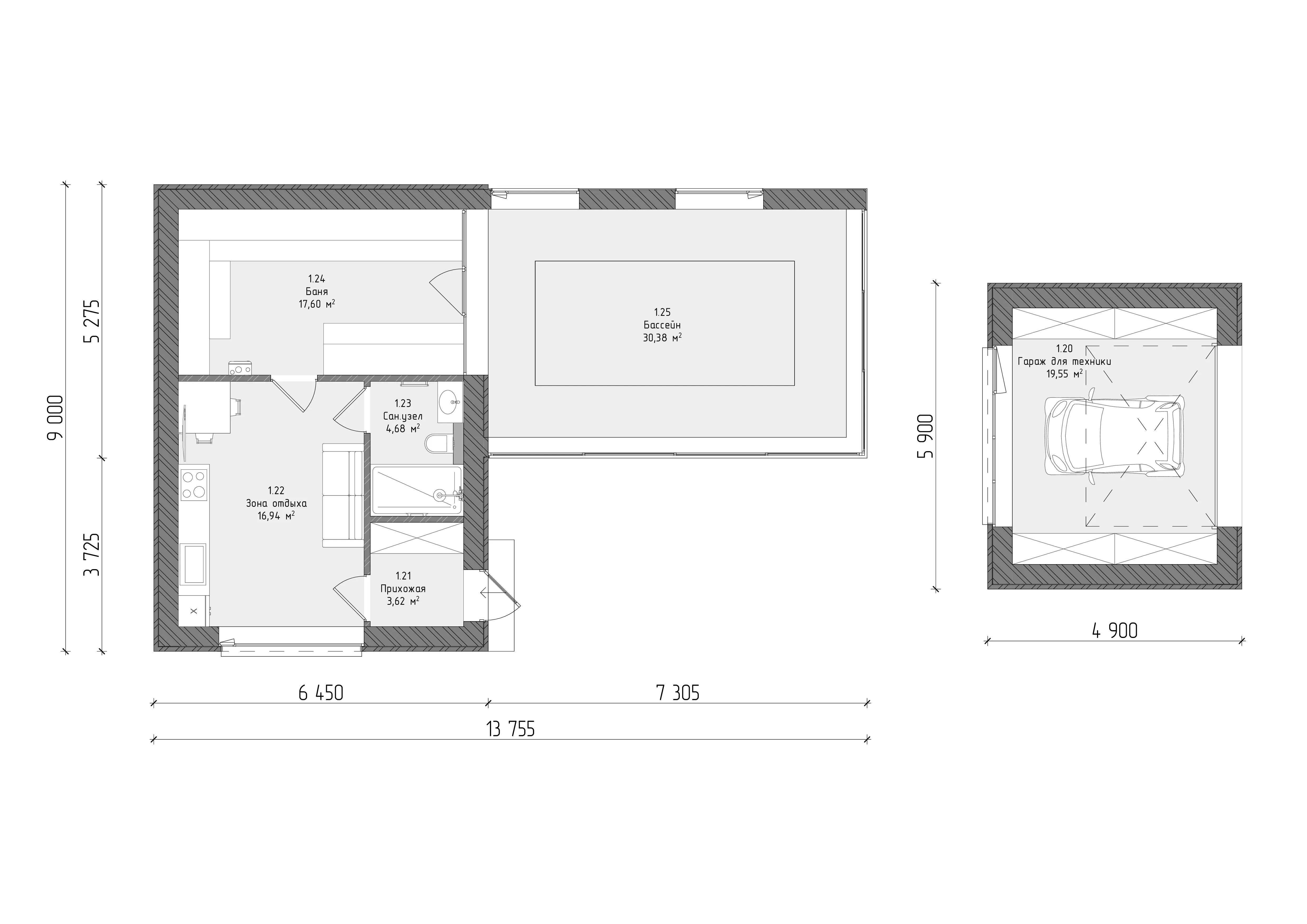 • Планировка пятна застройки на 1,2 метра шире границ дома;