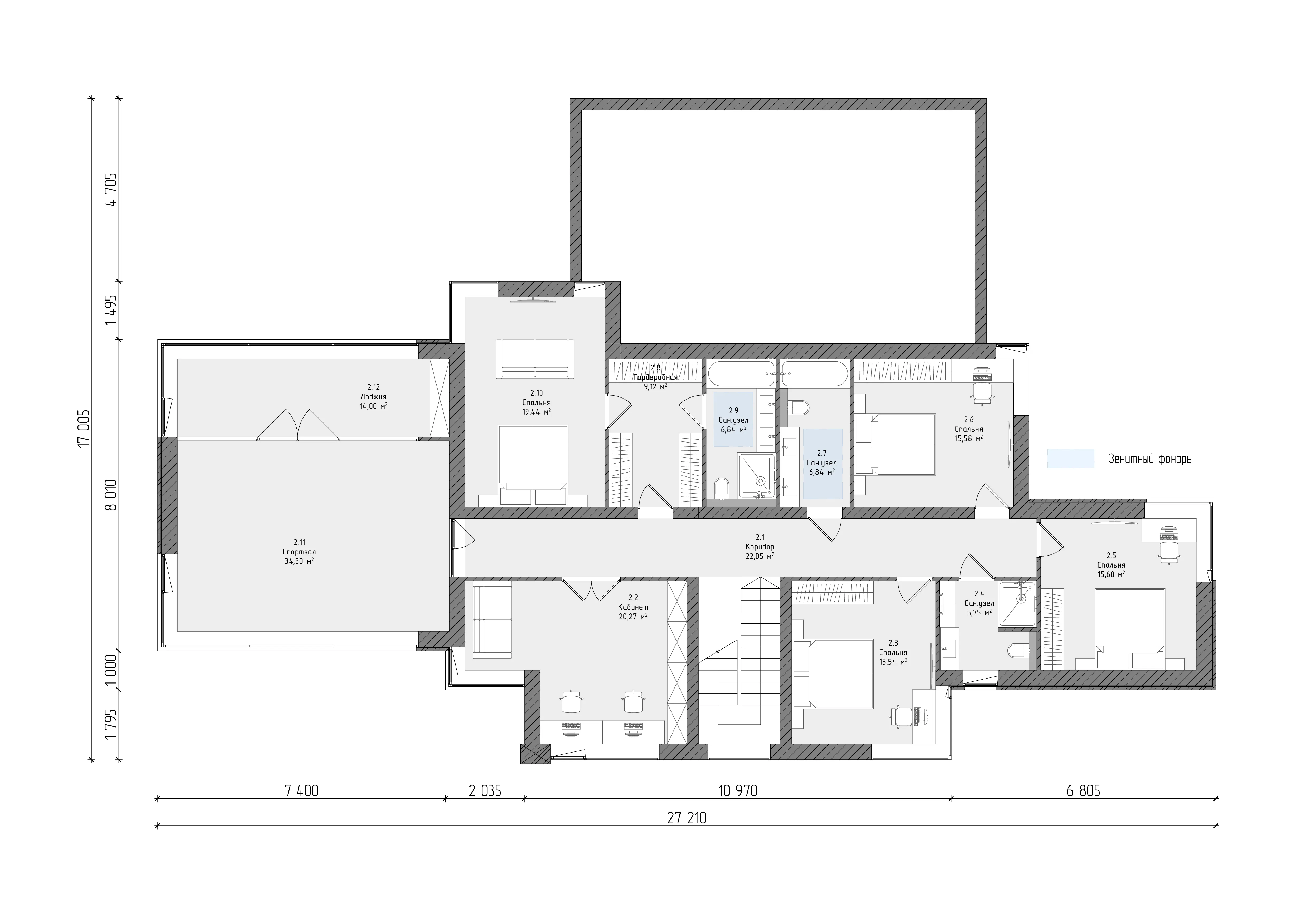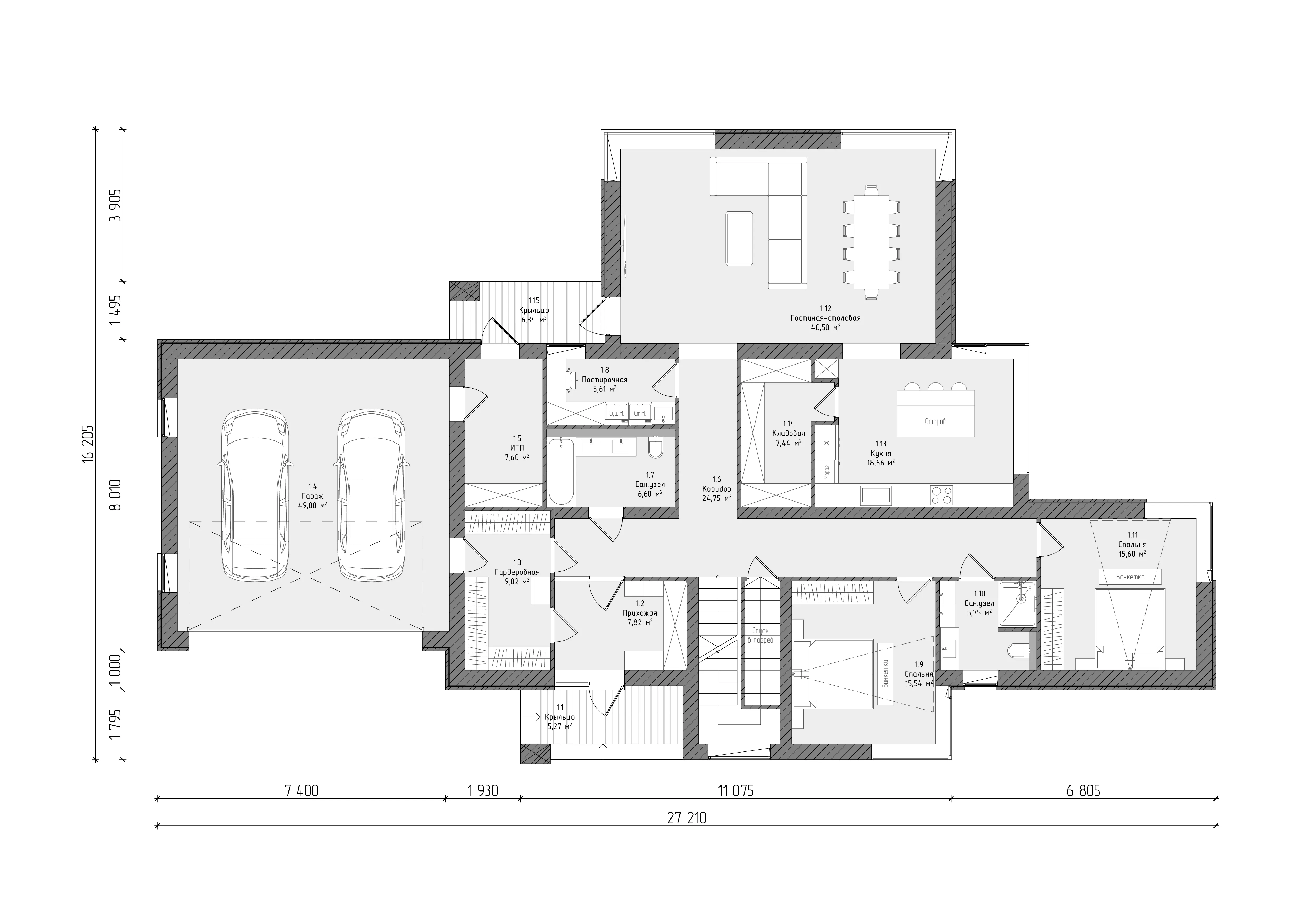 - Планировка пятна застройки на 1,2 метра шире границ дома;